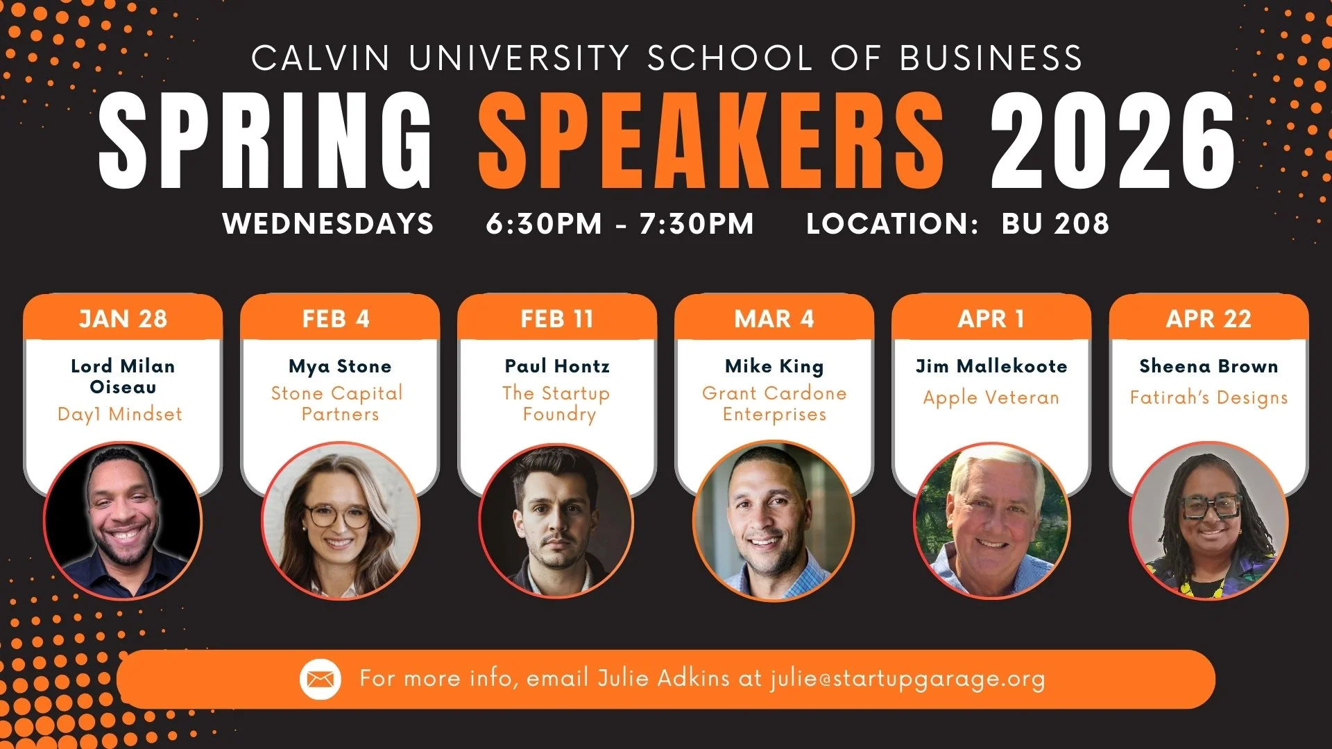 Startup Garage is built on a network of experienced mentors, inspiring speakers, and bold student founders who are shaping businesses that reflect the Gospel. Our mentors and speakers bring wisdom and real-world experience, while our student founders are launching ventures with faith at the center.